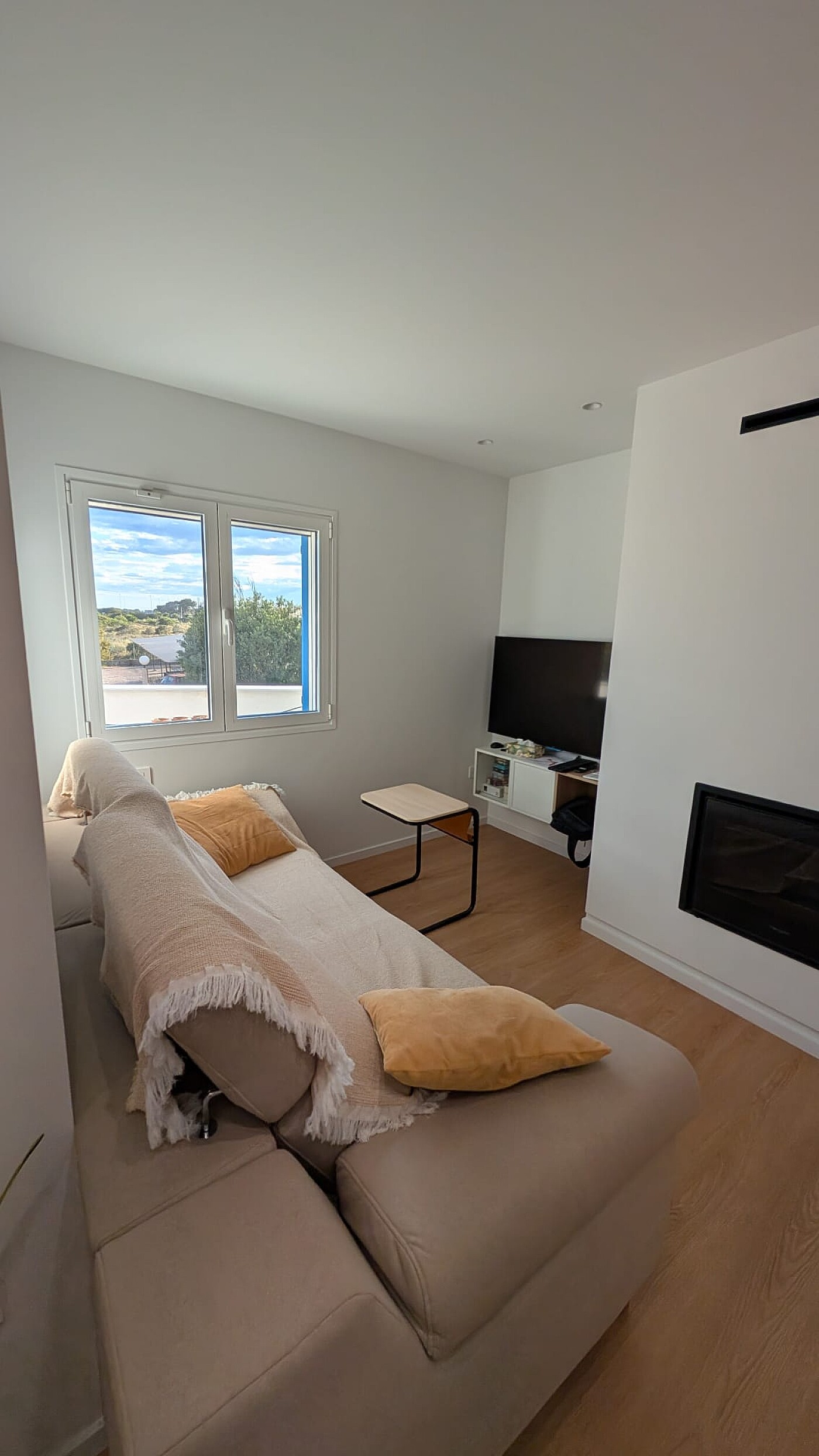 The bright living area includes a fully equipped open-plan kitchen with modern cabinetry and appliances, seamlessly integrated into a functional and contemporary space. A wood-burning fireplace adds warmth and charm.
