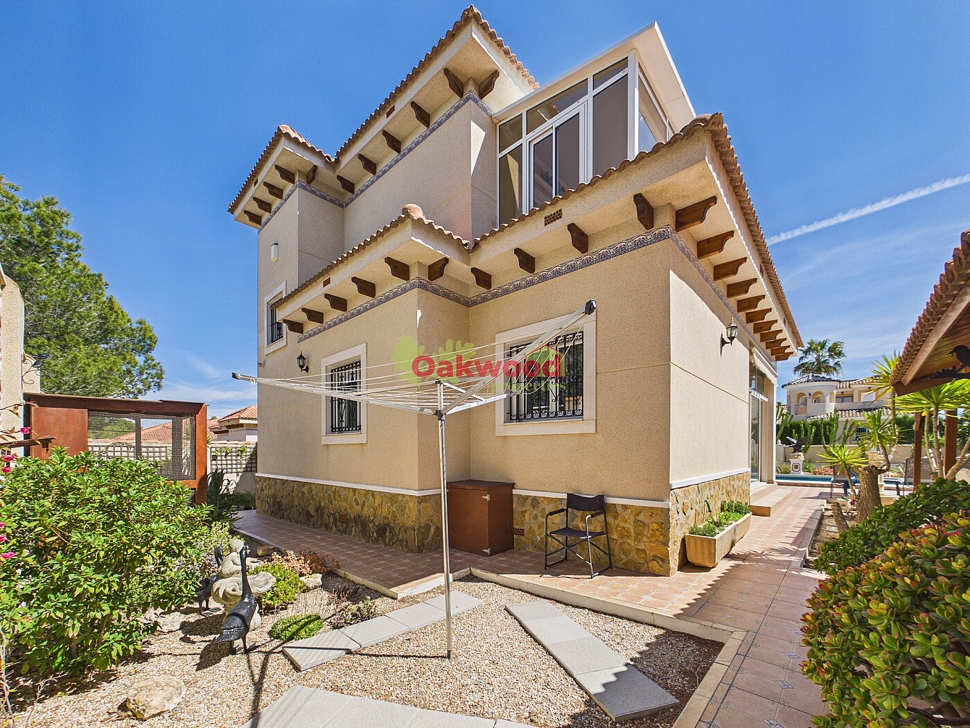 Approaching the property, you are welcomed by a generous plot of approximately 573 m² with a private driveway offering ample parking space. The manicured gardens immediately create a sense of calm and privacy, centred around a large private swimming pool and sun-lounging area designed for enjoying the region’s year-round sunshine.