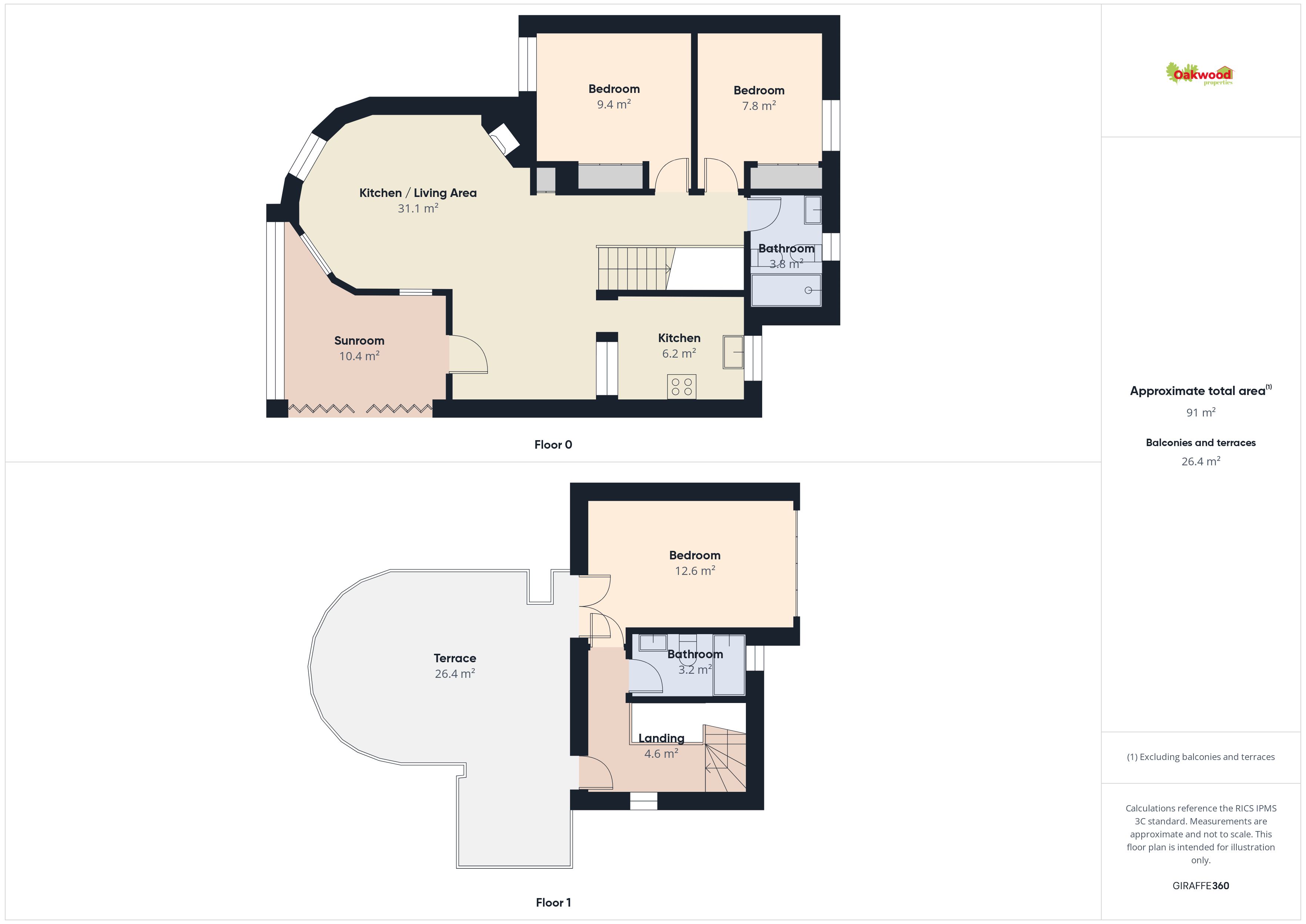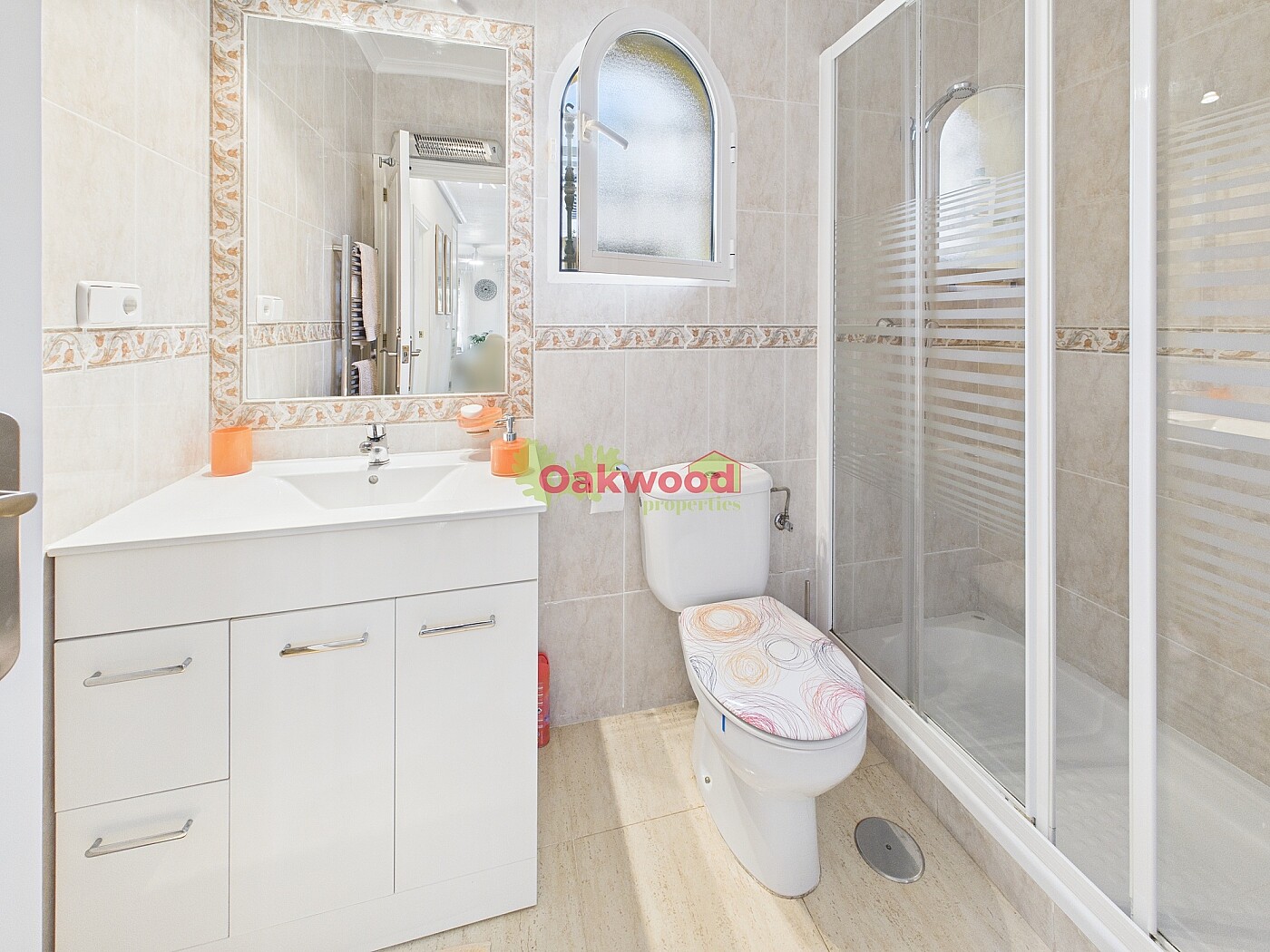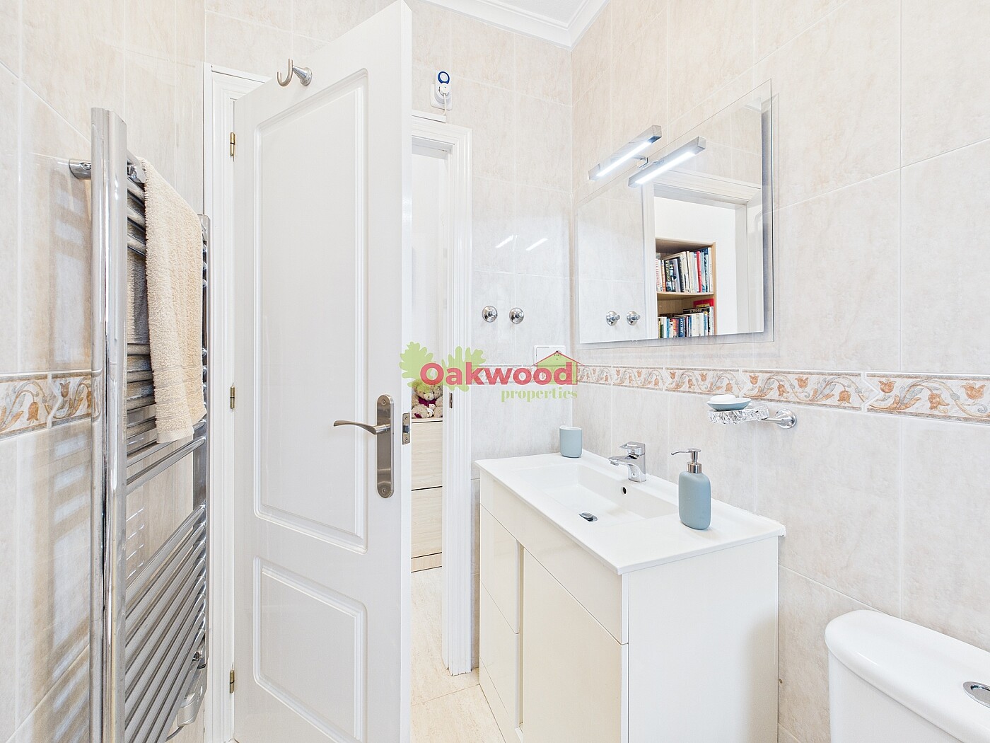 The ground floor also features two good sized double bedrooms, each with built-in wardrobes and air conditioning, along with a modern family bathroom. Upstairs, the layout continues to impress with another well-appointed family bathroom and a large master bedroom. This bright and airy space includes fitted wardrobes, air conditioning, and double patio doors that lead out to a spacious private balcony overlooking the garden and pool, perfect for enjoying the peaceful surroundings.