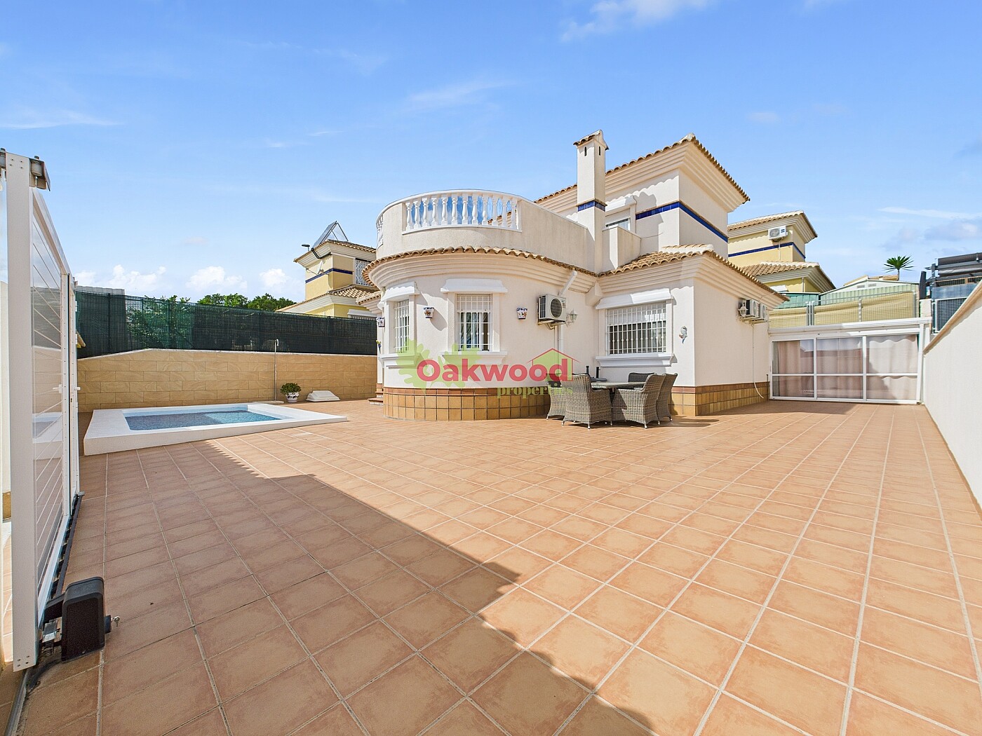 Deze prachtige vrijstaande villa is perfect gelegen in het hart van het nieuwe deel van Pinar de Campoverde, op slechts enkele minuten van supermarkten, winkels, restaurants, salons en de plaatselijke apotheek. De woning ligt op een ruim, volledig betegeld en onderhoudsarm perceel met voldoende parkeergelegenheid op eigen terrein. De zuidgerichte voorzijde geniet de hele dag van de zon en beschikt over een prachtig privézwembad — de ideale plek om te ontspannen of gasten te ontvangen. Aan de achterzijde bevindt zich een handige berging en een glazen tuinhuis dat het hele jaar door gebruikt kan worden.