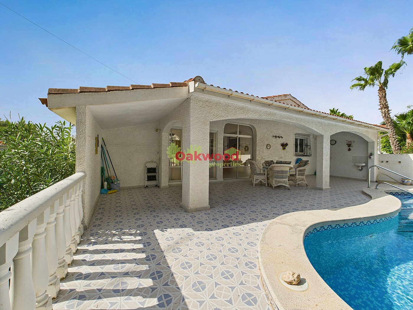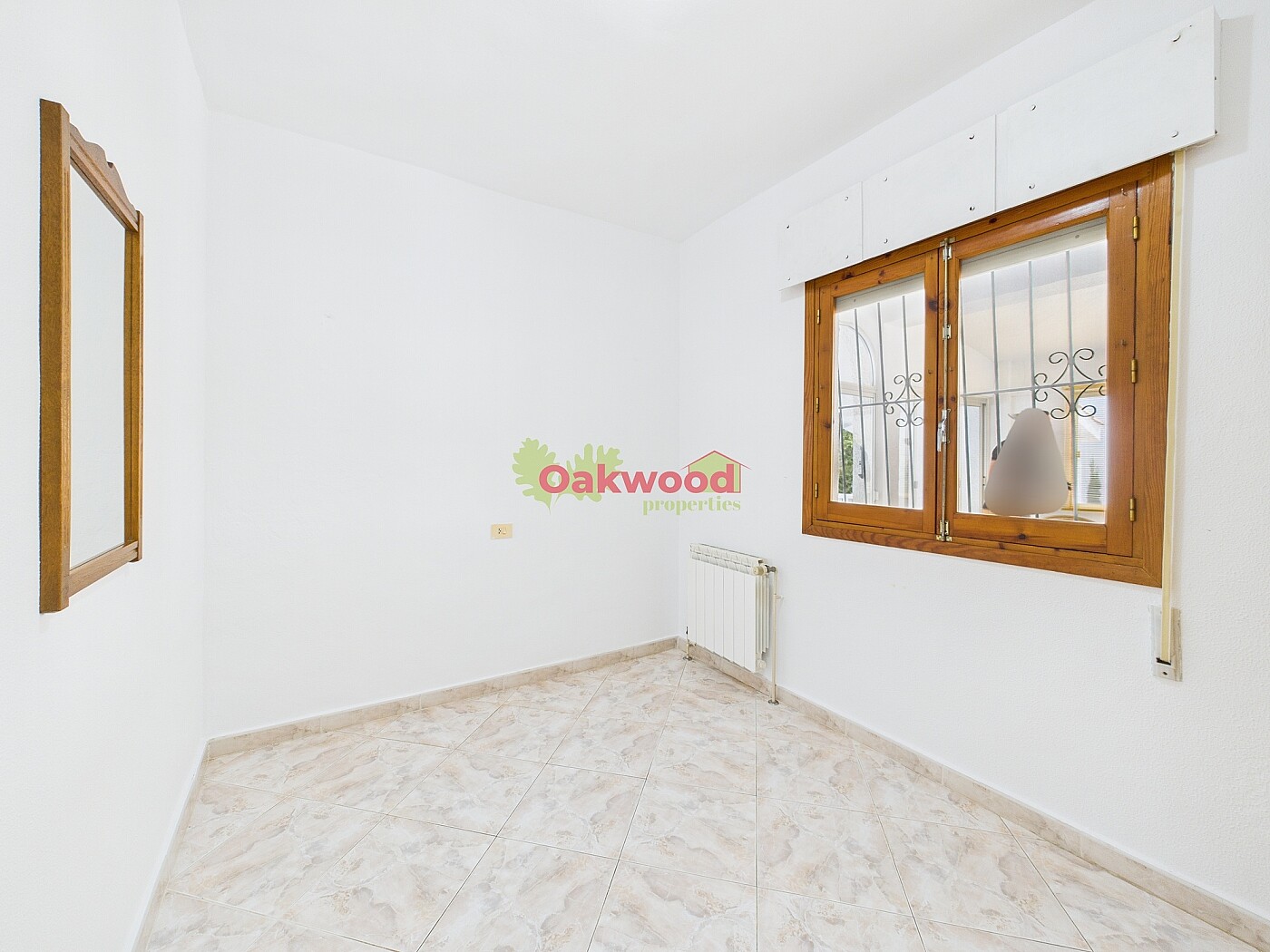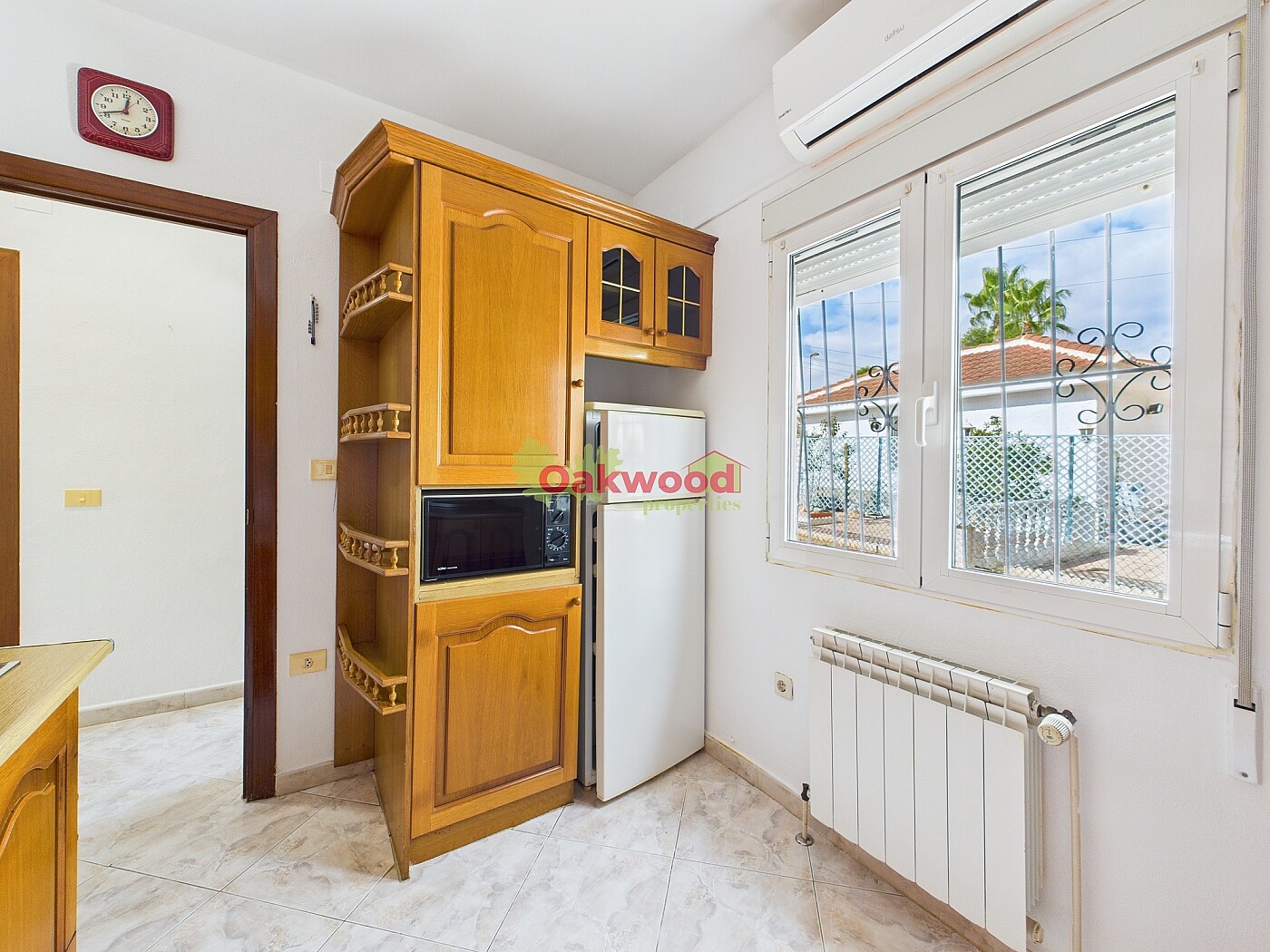 Deze vrijstaande villa ligt in een rustige straat in het oudere deel van Pinar de Campoverde en biedt charme, privacy en veel ruimte. Bij binnenkomst wordt u verwelkomd door een lichte, glazen eetkamer die gevuld wordt met natuurlijk licht. Vanuit hier leidt een gang u naar het hart van het huis. Aan de linkerkant openen dubbele deuren naar een ruime woonkamer met een traditionele bakstenen open haard, wat een warme en uitnodigende sfeer creëert. De villa beschikt over twee comfortabele slaapkamers, een complete familiebadkamer en een extra doucheruimte, terwijl de aparte keuken functionaliteit en privacy biedt.