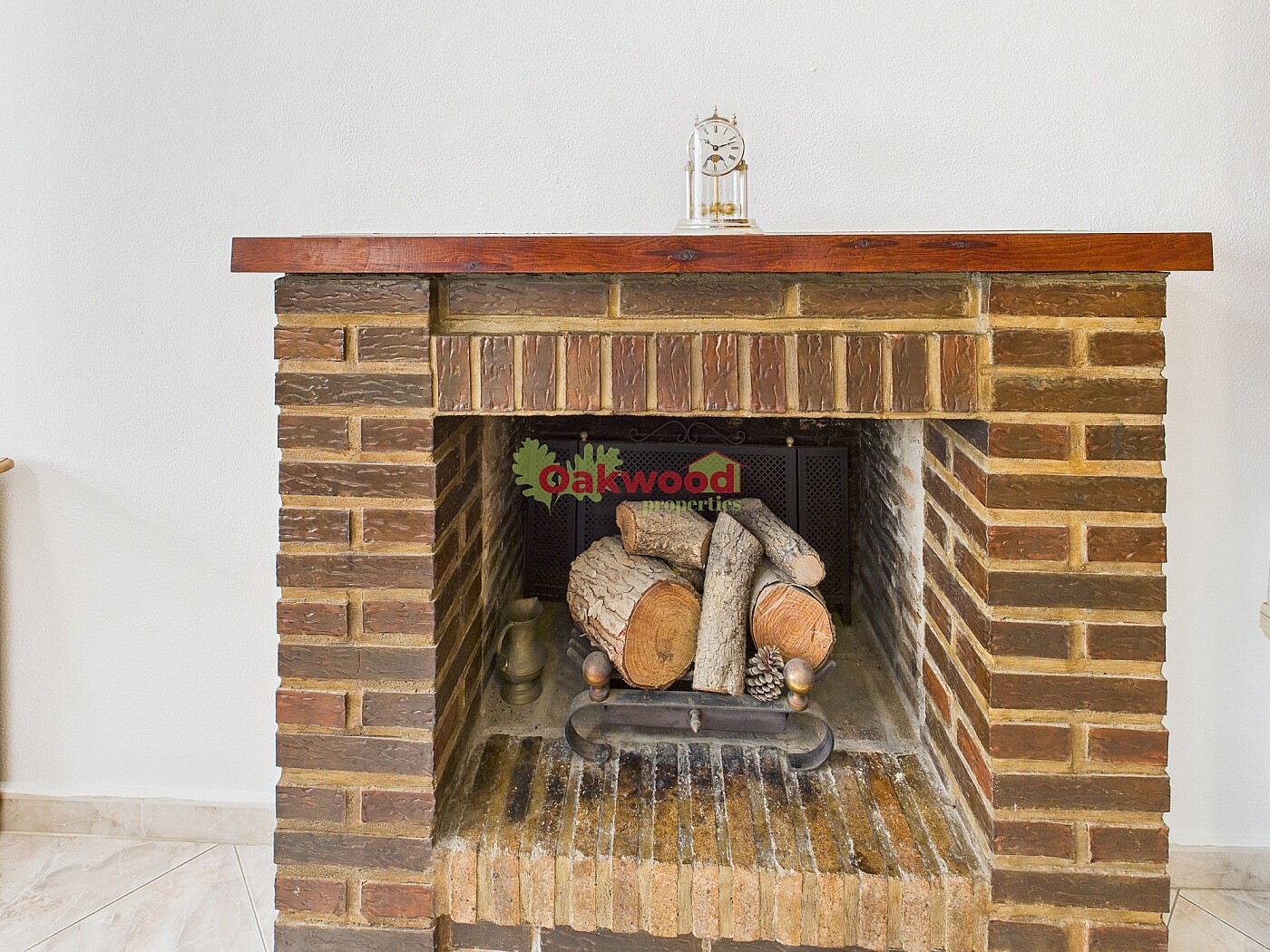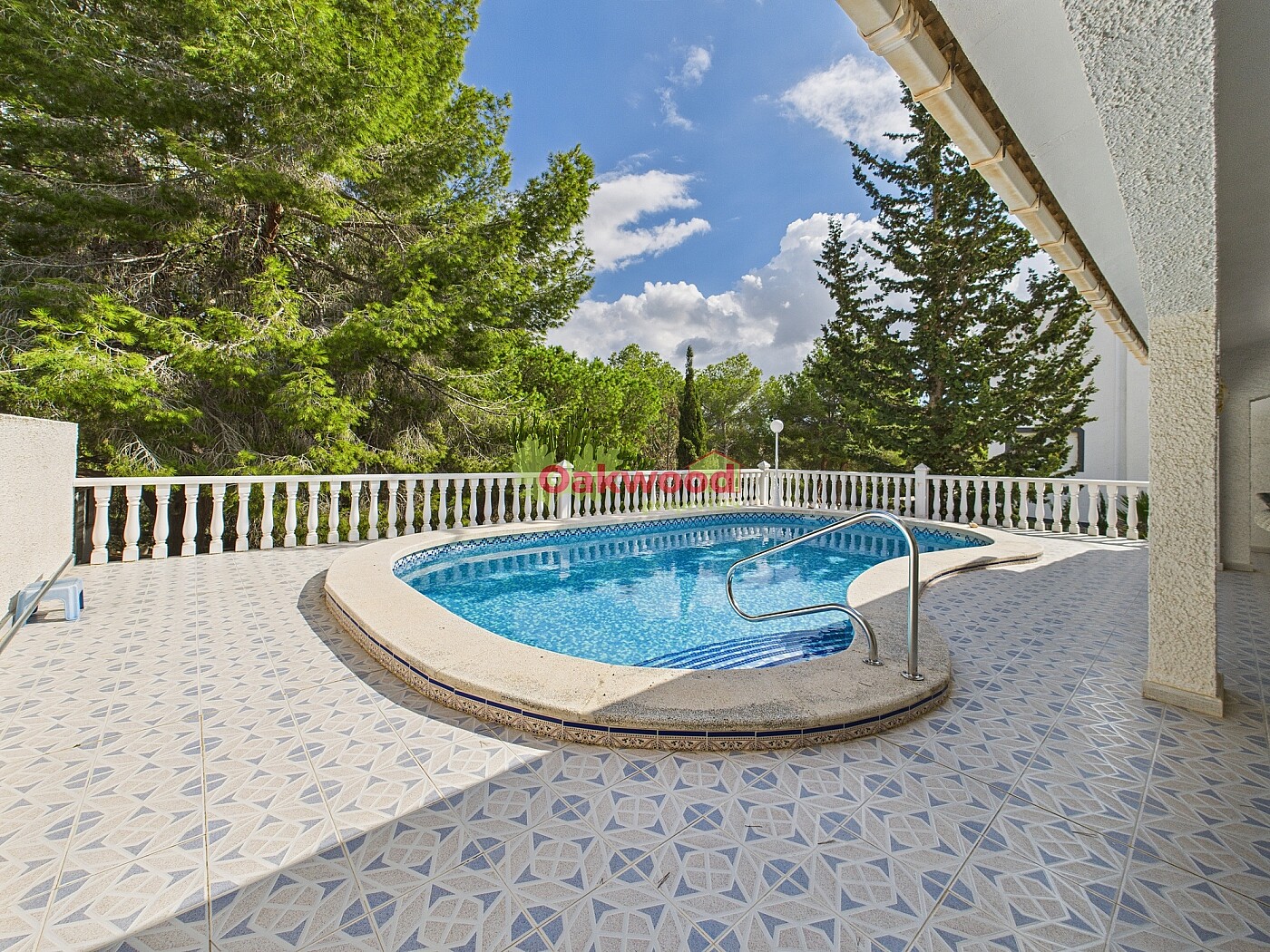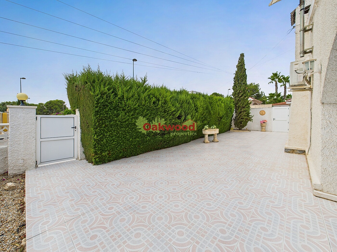 Deze vrijstaande villa ligt in een rustige straat in het oudere deel van Pinar de Campoverde en biedt charme, privacy en veel ruimte. Bij binnenkomst wordt u verwelkomd door een lichte, glazen eetkamer die gevuld wordt met natuurlijk licht. Vanuit hier leidt een gang u naar het hart van het huis. Aan de linkerkant openen dubbele deuren naar een ruime woonkamer met een traditionele bakstenen open haard, wat een warme en uitnodigende sfeer creëert. De villa beschikt over twee comfortabele slaapkamers, een complete familiebadkamer en een extra doucheruimte, terwijl de aparte keuken functionaliteit en privacy biedt.