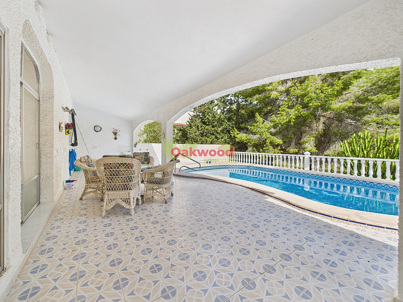 De openslaande deuren aan de achterzijde leiden naar het zwembadgedeelte, waar een overdekt terras met elegante bogen het uitzicht omlijst en karakter toevoegt aan deze ontspannen buitenruimte. Het zwembadgedeelte is perfect om gasten te ontvangen of gewoon te genieten van de mediterrane levensstijl.